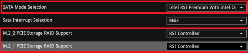 B | **M.2\_1 RST PCIE Storage RAID Support** > Enabled / RST Controlled