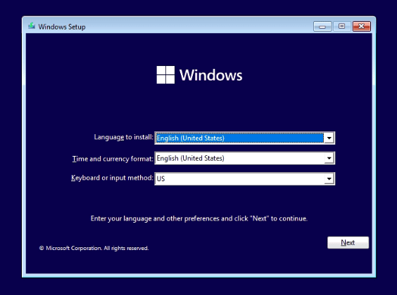 **Save & Exit** the BIOS and ensure your Windows USB is plugged in. You should see the Windows setup screen: